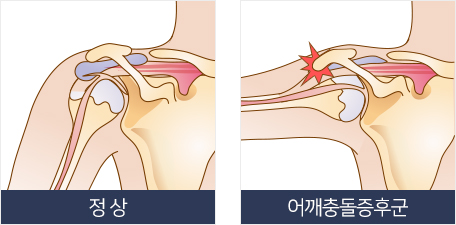 어깨충돌증후군은 어깨 힘줄인 회전근개가 그 위에 있는 견봉 뼈와 부딪혀 염증을 일으키는